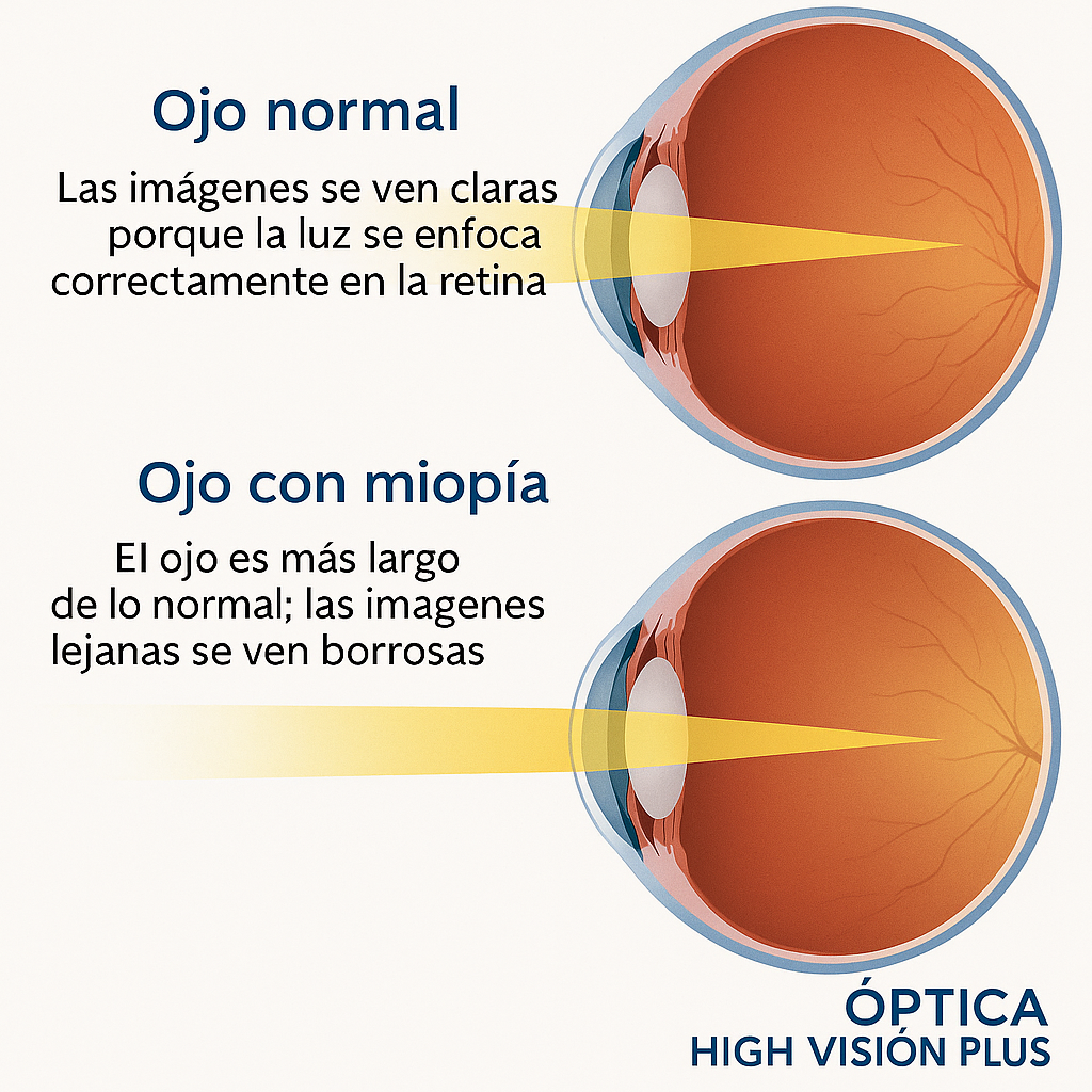 La miopía provoca que la persona vea bien de cerca pero borroso de lejos. Ocurre cuando la luz se enfoca por delante de la retina porque el ojo es más largo de lo normal o la córnea está más curva.
