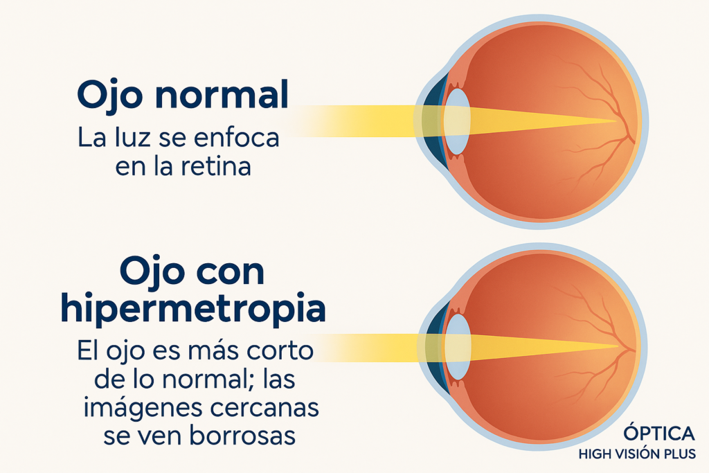 La hipermetropía se caracteriza por dificultad para ver de cerca. La luz se enfoca por detrás de la retina porque el ojo es más corto o la córnea es más plana.