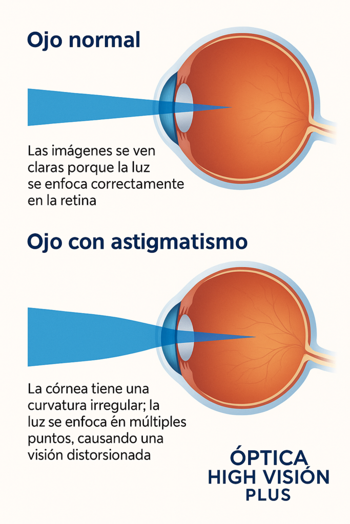 El astigmatismo se produce por una curvatura irregular de la córnea o del cristalino. Esto provoca visión distorsionada o borrosa tanto de lejos como de cerca.